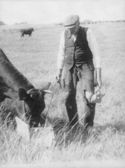 Så når mørket var faldet på, i hvert fald om vinteren, det kan jeg osse huske, når man kom derover, så sad han jo og malkede, klokken var henad en syv - otte stykker om aftenen, så sad han jo derude og malkede, med flagermuslygten den hængte på sømmet der. Så lige pludselig så sad han og faldt i søvn, det var han meget slem til, når vi nåede aften, så var han vel træt og så han havde altid så’en en cigarstump i munden og den tabte han jo ned i mælken, og så nåh den kunne han ikke bruge mer’, så smed han den væk. Det var jo ikke særligt hygiejnisk, det kan man ikke sige, men altså så’en var det, fortæller Svenn Johansen